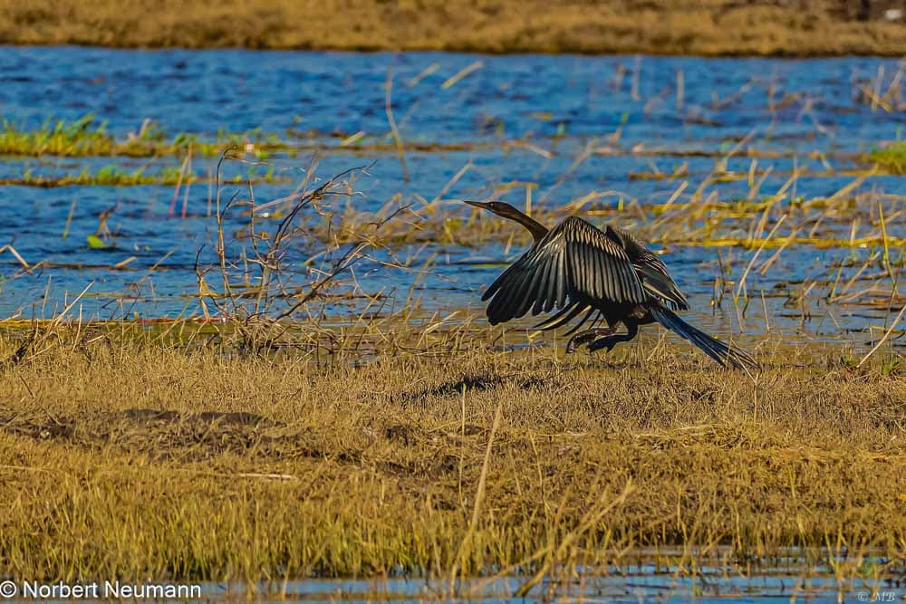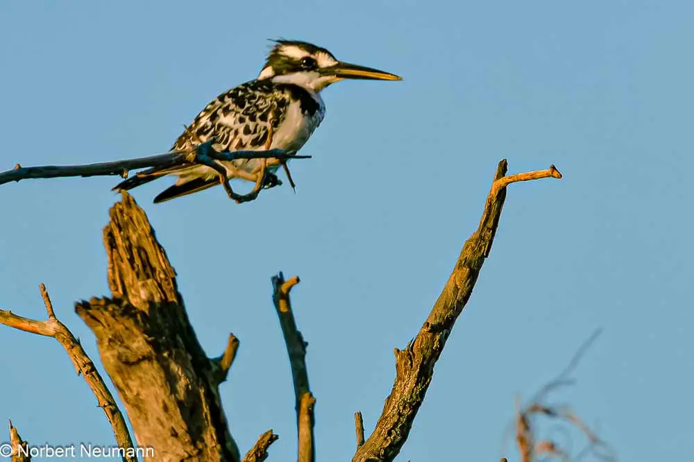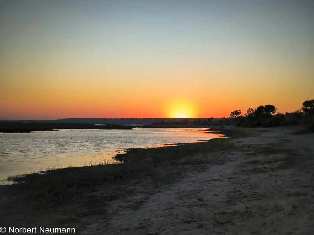Dann gibt der Dickicht den Blick auf eine flache Fläche frei. Wir stehen am Chobe-Fluss. Der Anblick des Sonnenaufgangs entschädigt für das frühe Aufstehen. Jetzt fahren wir am Fluss entlang und können ein paar Flusspferde entdecken. Zahlreiche Wasservögel warten ebenfalls darauf, fotografiert zu werden.
