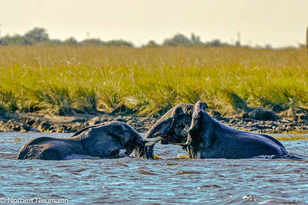 Wir fahren gemächlich weiter und entdecken eine Gruppe Kaffernbüffel auf einer Insel im Chobe Fluss. Diese beeindruckenden Tiere sind wahre Kraftpakete. Der Anblick wechselt nun wieder zu einer etwas größeren Elefantenherde am Ufer. Der Chobe Fluss zieht anscheinend alle Tiere an. Wir sind total beeindruckt von der Tierdichte. Es herrscht ein reges Kommen und Gehen.