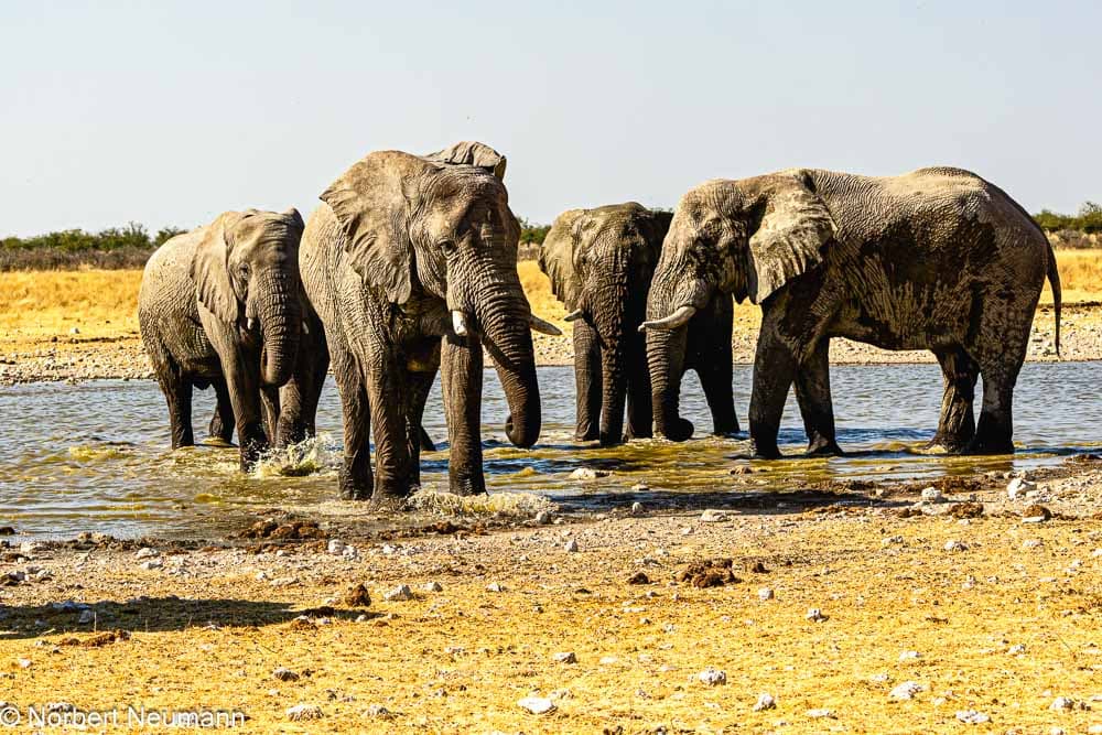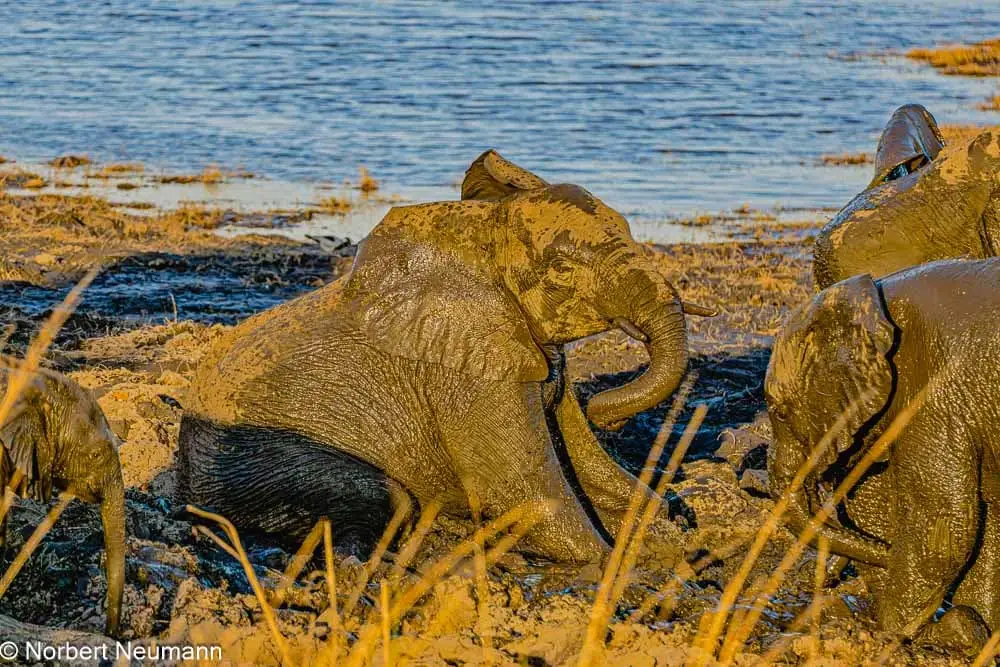 In der Ferne können wir auch Giraffen beobachten. Eine Elefantenfamilie gönnt sich ein ausgiebiges Schlammbad, was für die kleinen Elefantenkinder ein Riesenspaß ist.