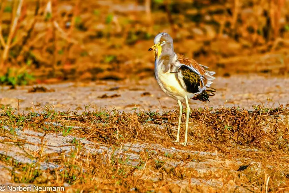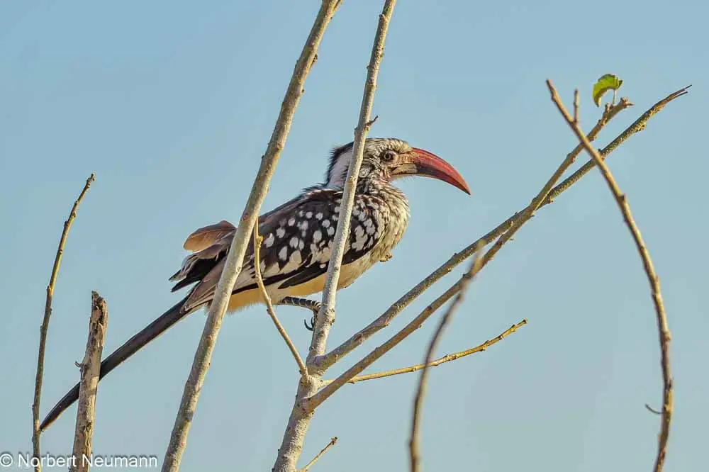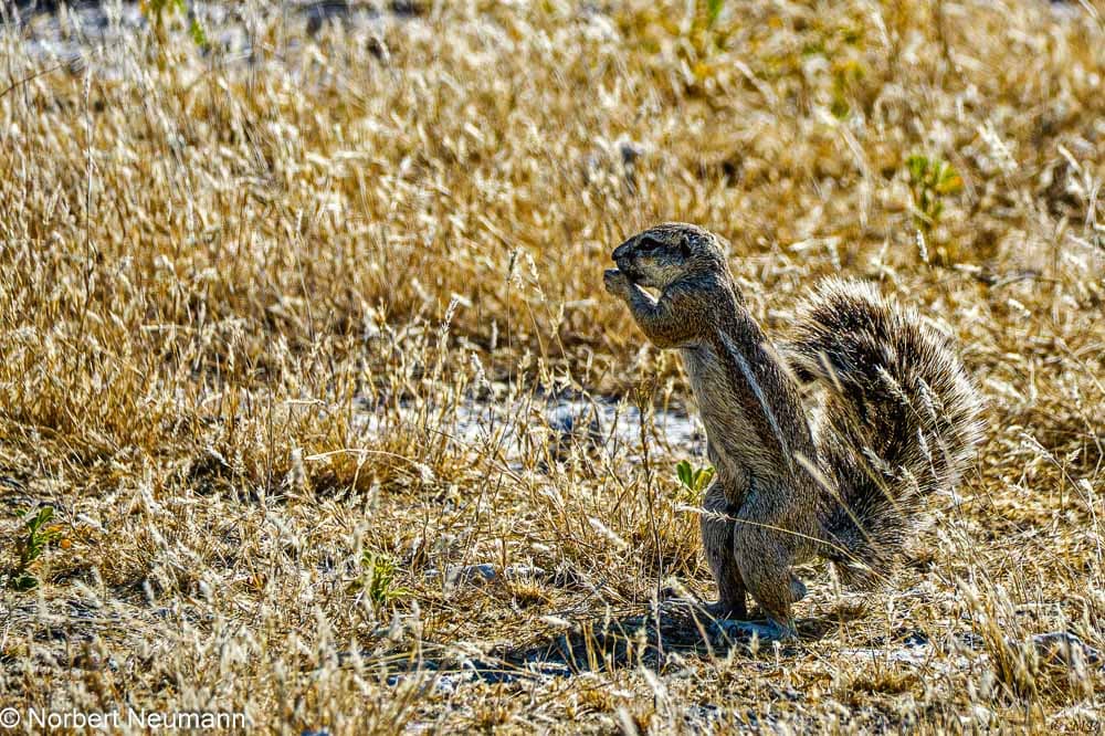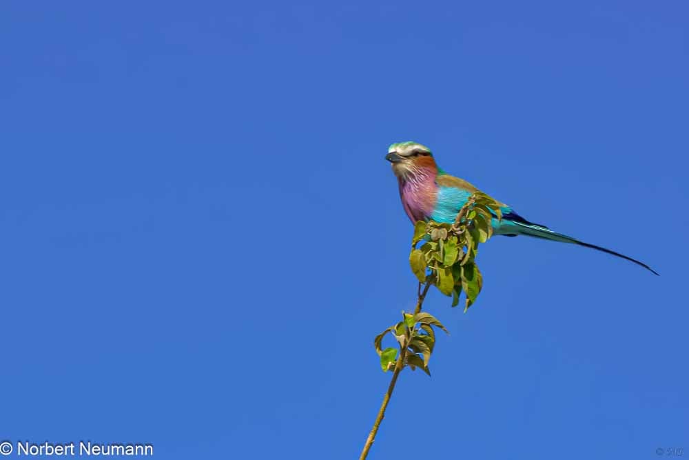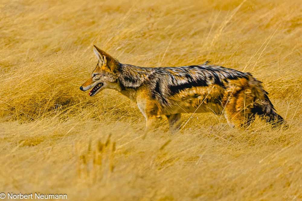 Langsam und vorsichtig ziehen wir uns zurück. Und langsam bewegen wir uns nun auch wieder in Richtung Ausgang des Nationalparks. Ein Schakal kreuzt unseren Weg und links und rechts kann die bunte Vogelwelt bewundert werden.