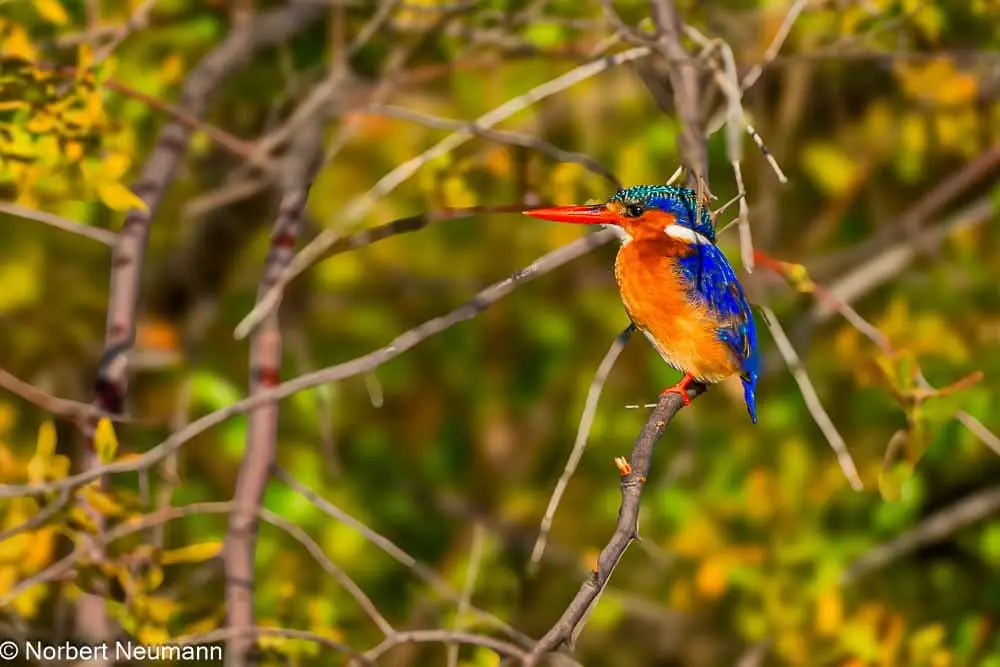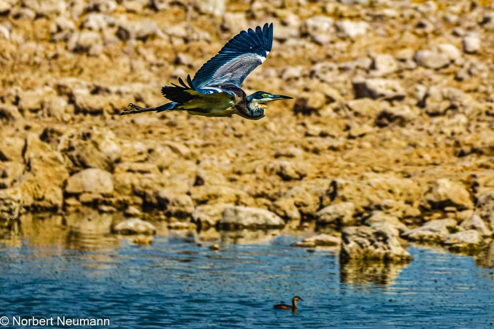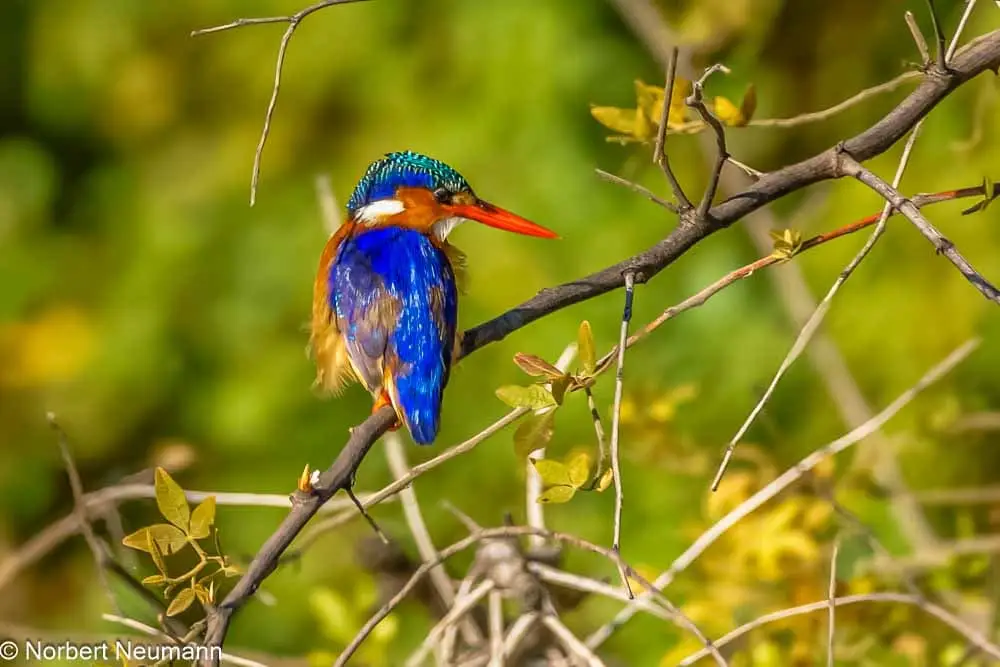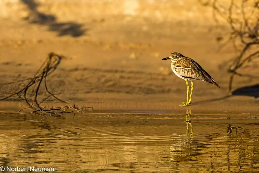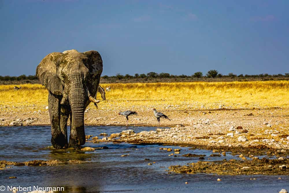 Langsam und vorsichtig ziehen wir uns zurück. Und langsam bewegen wir uns nun auch wieder in Richtung Ausgang des Nationalparks. Ein Schakal kreuzt unseren Weg und links und rechts kann die bunte Vogelwelt bewundert werden.