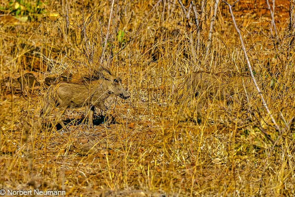Jetzt ist es nicht mehr weit bis zum Tor. Ein paar Warzenschweine bilden den Abschluss dieser Safari. Um 09:30 Uhr sind wir wieder in unserer Lodge.