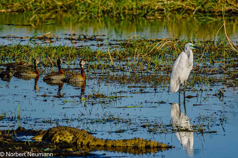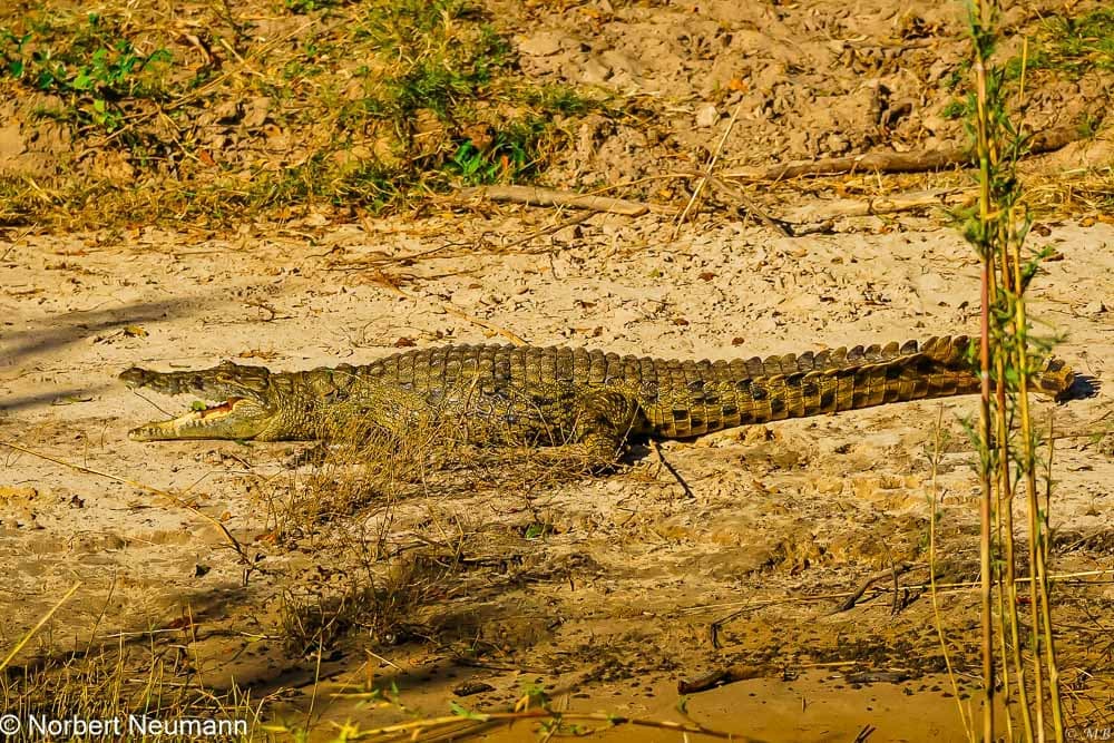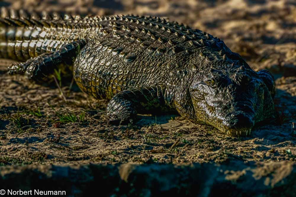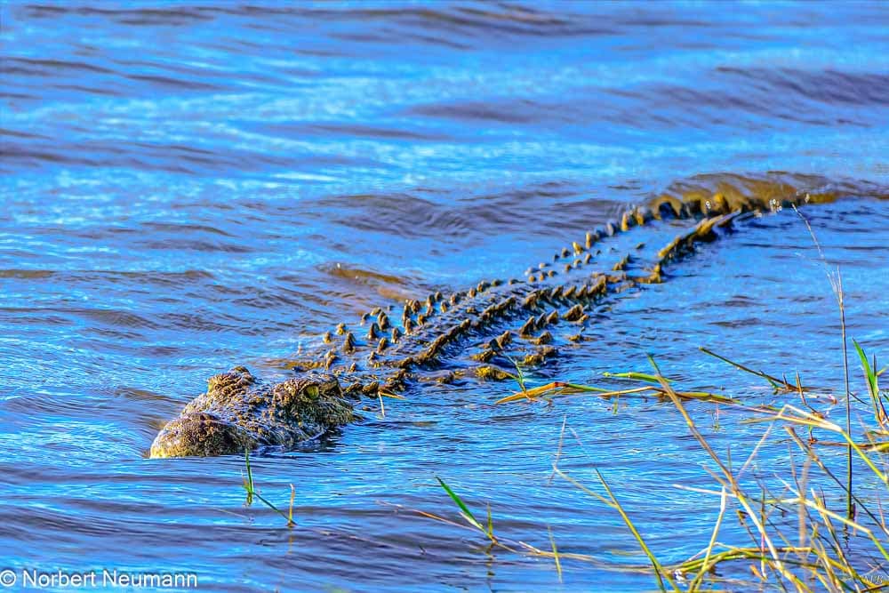 Es ist 14:45 Uhr und wir sind zurück am Steg. Jetzt kann unsere Bootssafari auf dem Chobe Fluss beginnen. Schon beim Betreten des Bootes spürt man diese besondere Stimmung. Das Wasser funkelt in der Nachmittagssonne und die Luft ist erfüllt mit dem Gesang der Vögel. Wasser ist Leben, das fühle ich hier. Nach nur wenigen Minuten erblicken wir das erste Krokodil am Ufer und ein weiteres schwimmt im Wasser. Anscheinend gibt es hier jede Menge Krokodile. Die Warnschilder am Weg zum Steg waren also nicht ohne Grund.