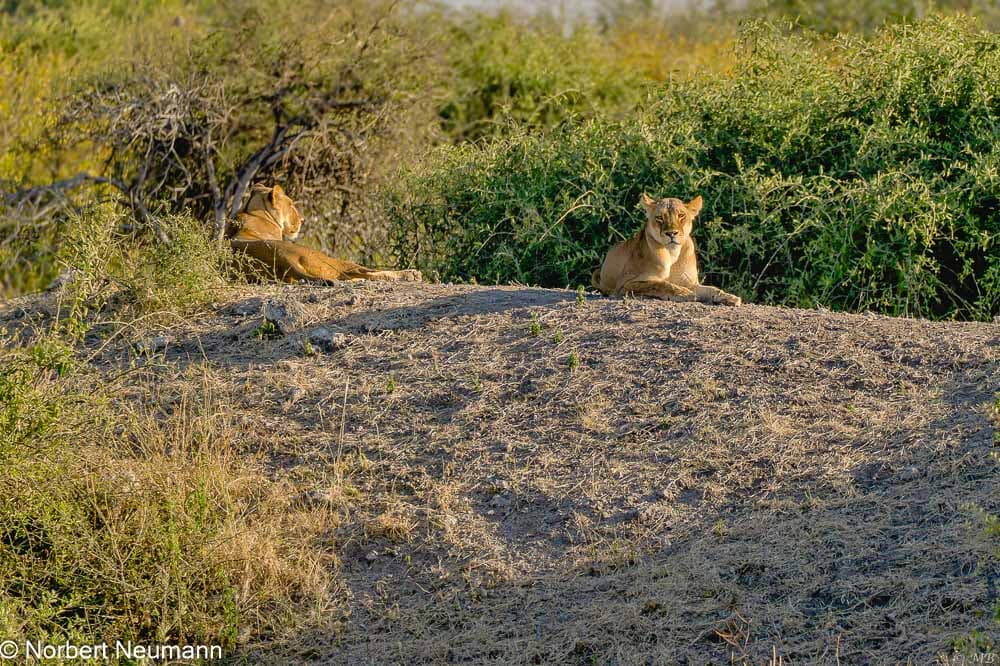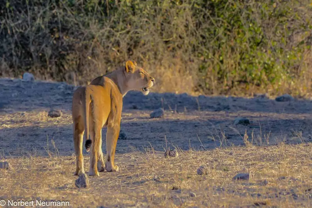 Pünktlich um 06:00 Uhr teilt sich unsere Gruppe auf zwei wartende Geländewagen auf. Das Abenteuer kann beginnen. Wir passieren das Tor und die Geländewagen schlängeln sich über einen Sandweg. Links und rechts ist dichter Busch. Neugierig halten wir die Augen offen, entdecken anfangs nichts.