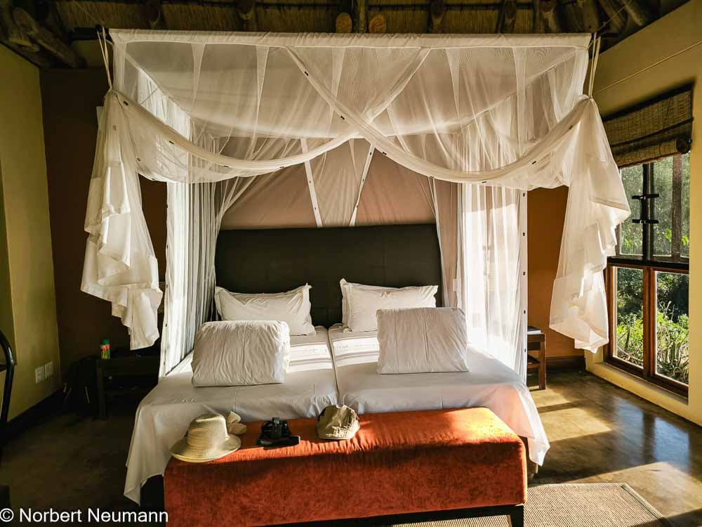 Auf dem Weg gibt uns Christopher ein paar nützliche Infos: Wir müssen uns keine Sorgen um Trinkwasser machen, es gibt immer einen Kanister im Auto, aus dem sich jeder bedienen kann. Und viel Bargeld brauchen wir auch nicht, in den Unterkünften kann man in der Regel mit Kreditkarte zahlen. Später haben wir aber auch die Möglichkeit, Geld abzuheben. Moskitonetze sind selbstverständlich über jedem Bett vorhanden. Kurz gesagt: Entspannt euch und genießt die Reise!