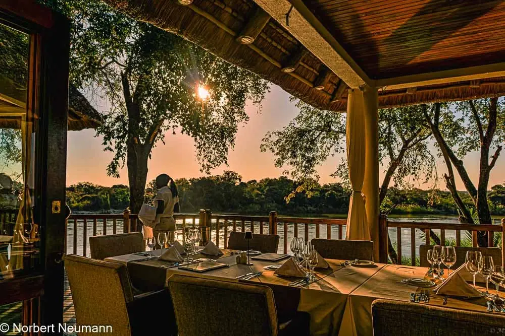 Die Safari Lodge ist etwas schöner und liegt direkt am Fluss. Dorthin zieht es uns, nachdem wir eingecheckt und unsere Zimmer bezogen haben. Wir bestellen uns einen Drink an der Bar und genießen den Blick auf den Chobe-Fluss.