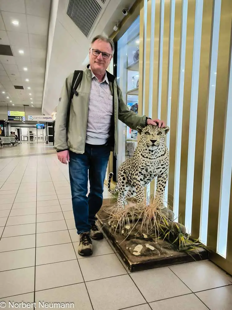 Wir machen einen kurzen Halt in Windhoek, der Hauptstadt von Namibia. Unser Gepäck bleibt im Flugzeug, da wir mit dem gleichen Flieger weiterreisen. Wir Passagiere müssen das Flugzeug verlassen und etwa eine Stunde im Terminal warten. Draußen sind angenehme 10 Grad, ganz schön kühl!