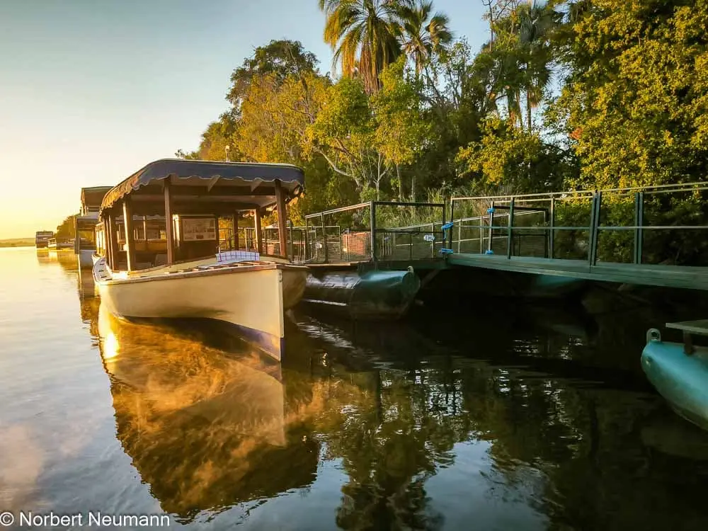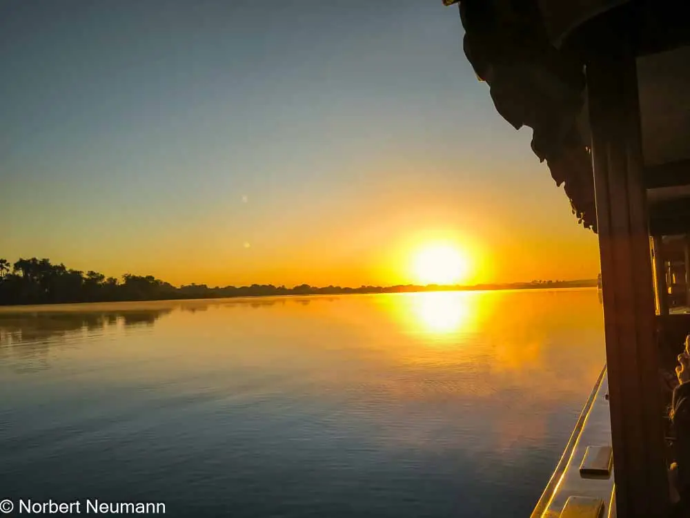 Heute Morgen steht eine zweistündige Bootstour auf dem Programm. Wie der Afrikaforscher David Livingstone einst, erkunden wir den Sambesi mit dem nostalgischen Boot Ra-Ikane. Dieses Boot bringt uns zurück in die Vergangenheit und lässt uns die vielfältige Tier- und Pflanzenwelt näher kennenlernen.
