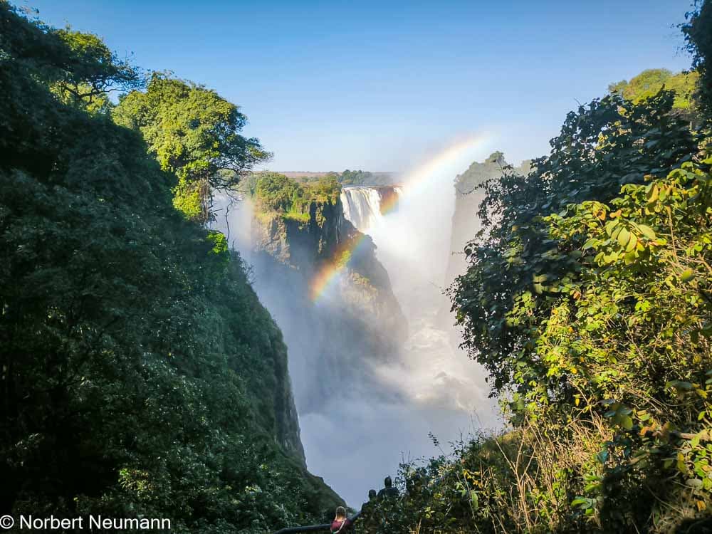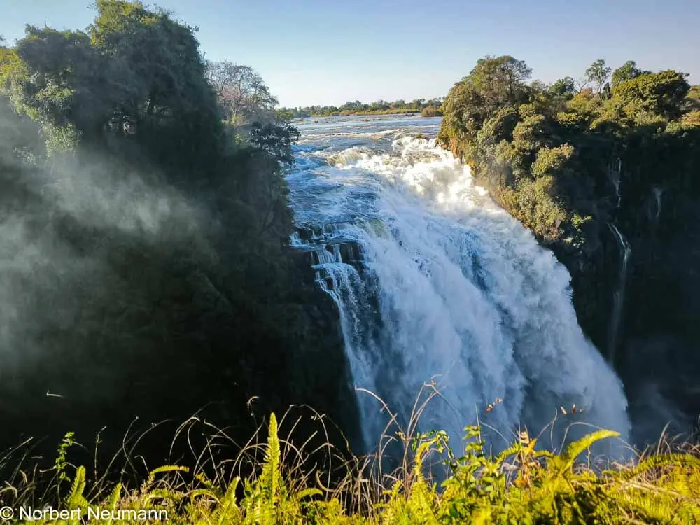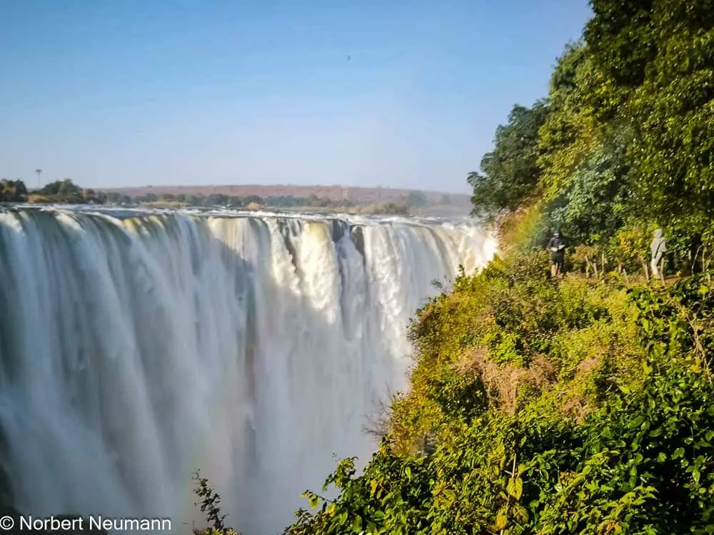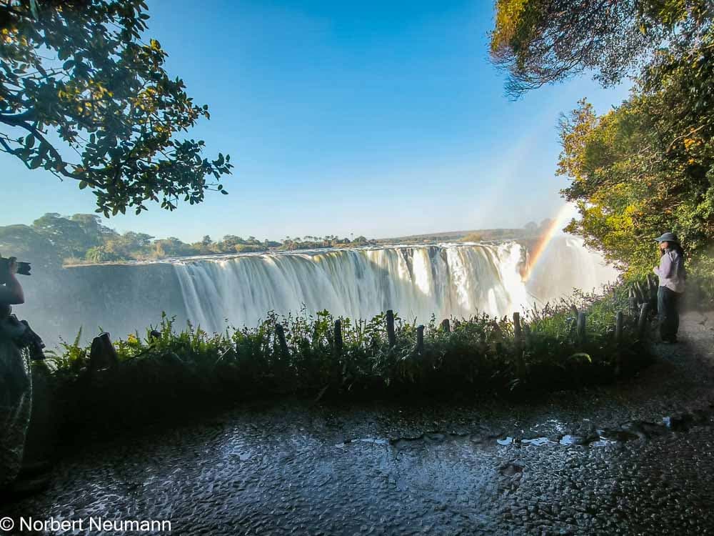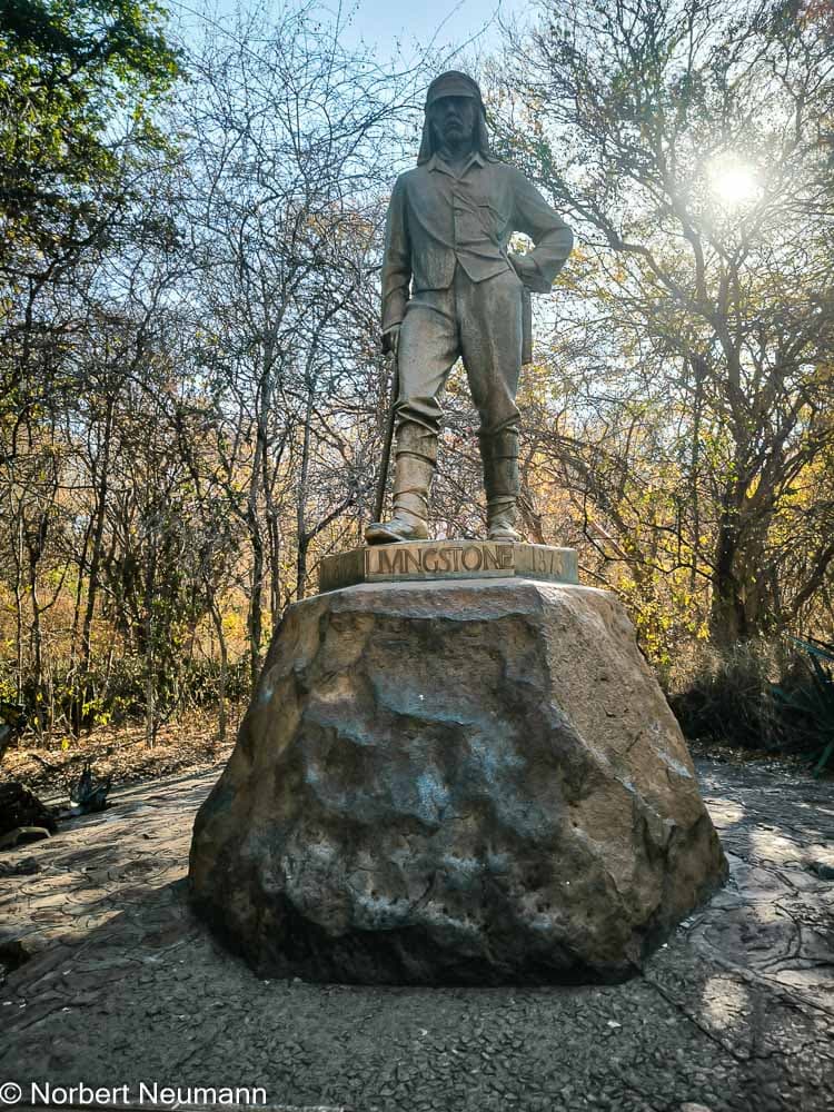 Jetzt geht’s weiter zu Aussichtspunkt 1, dem Teufelskatarakt und der Statue von Livingstone. Der Schotte David Livingstone war der erste Europäer, der die Victoriafälle am 16. November 1855 entdeckte und darüber berichtete. Er benannte sie nach Königin Victoria. Die Einheimischen nennen sie Mosi-oa-Tunya, was so viel wie „der Rauch, der donnert“ bedeutet.