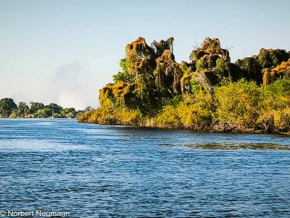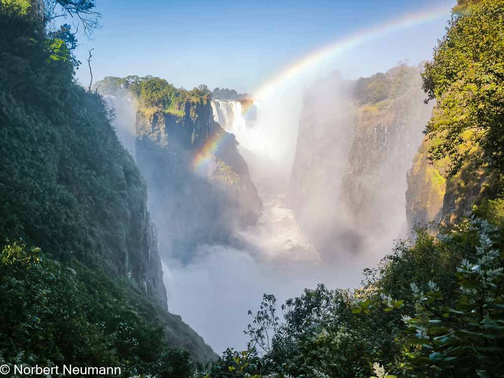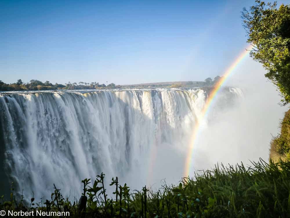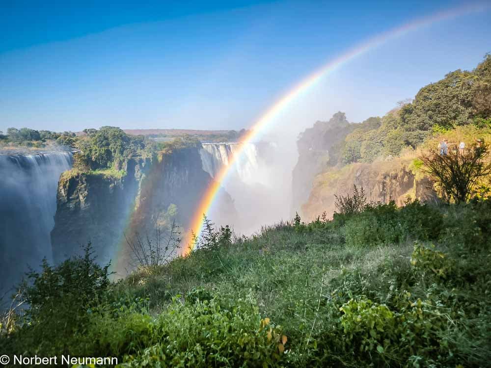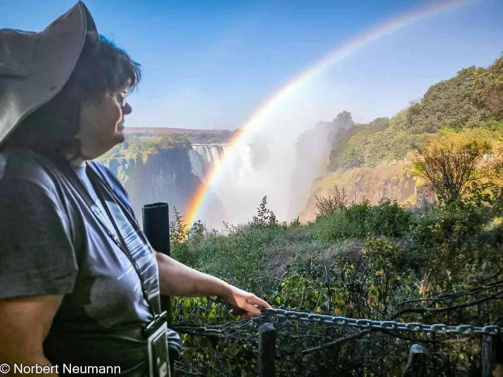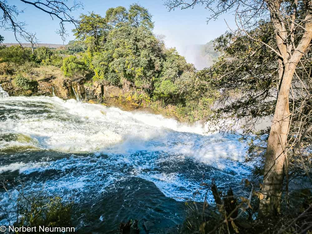 Jetzt geht’s weiter zu Aussichtspunkt 1, dem Teufelskatarakt und der Statue von Livingstone. Der Schotte David Livingstone war der erste Europäer, der die Victoriafälle am 16. November 1855 entdeckte und darüber berichtete. Er benannte sie nach Königin Victoria. Die Einheimischen nennen sie Mosi-oa-Tunya, was so viel wie „der Rauch, der donnert“ bedeutet.