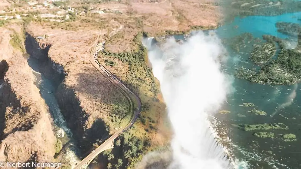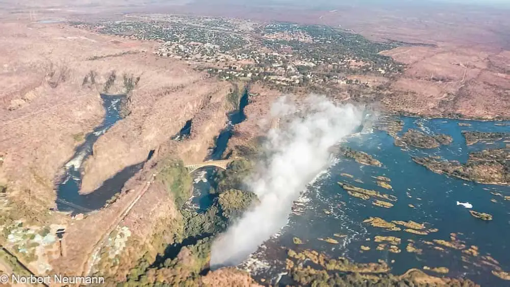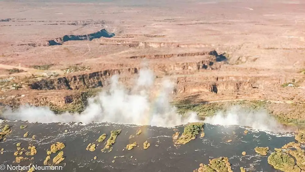 Aus der Vogelperspektive bekommen wir einen fantastischen Blick auf die Lage und Form der Victoriafälle. Jetzt im Juli, zu Beginn der Trockenzeit, stürzen immer noch gewaltige Wassermassen herab, während die Gischt bis zu hunderten Metern in die Höhe spritzt. Das Ganze wird von wunderschönen Regenbögen umrahmt. Der Anblick ist einmalig.