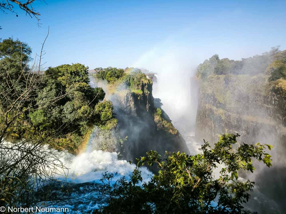 Aussichtspunkt 14 – Rainbow Falls ist mit 108 m der tiefste Abschnitt. Der Weg hier ist schon sehr rutschig und nass. Dann folgt der östlichste Aussichtspunkt 15 auf der simbabwischen Seite, der Danger Point. In der Trockenzeit kann man über die Felsen zum Danger Point klettern und einen atemberaubenden Blick in die Schlucht genießen. Ich versuche es mal, rutsche aber an einem Felsen ab und muss mich mit beiden Händen an dem glitschigen Felsen festhalten. Dieser Punkt ist wirklich eine Herausforderung. Vorsichtig auf allen Vieren ziehe ich mich zurück.