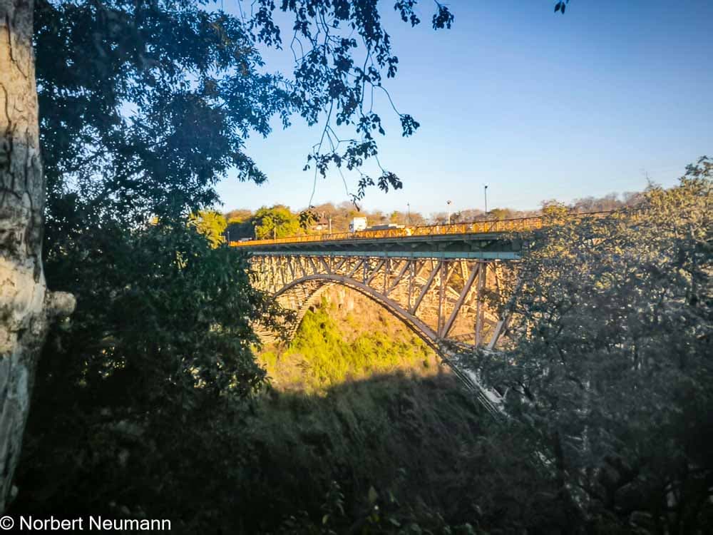 Der letzte Abschnitt des Weges führt dann wieder etwas südwestlicher und weg vom Regen. Er endet direkt am Aussichtspunkt 16 mit Blick auf die Victoria Falls Bridge. Die Victoria Falls Bridge überspannt den Sambesi direkt unterhalb der Victoriafälle. Sie wurde über der zweiten Schlucht der Fälle erbaut. Offiziell eröffnet wurde sie am 12. September 1905 von Professor George Howard Darwin, dem Sohn von Charles Darwin.