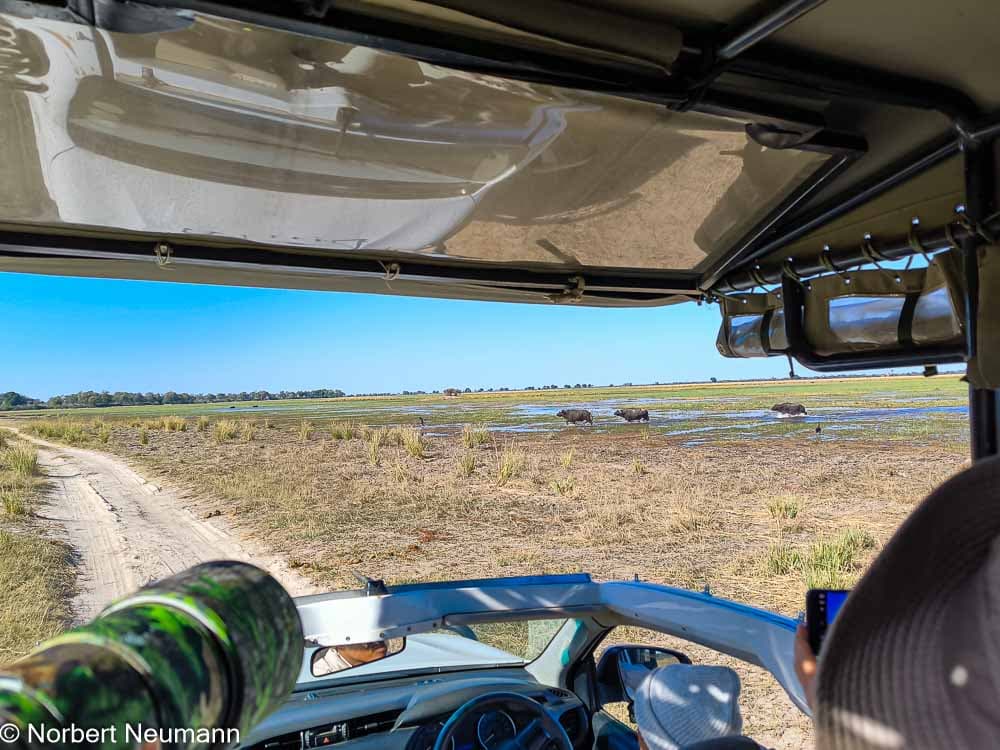 Dann fahren wir einen Weg entlang des Ufers und entdecken die ersten Kaffernbüffel. Sie stehen bis zu den Knien im Wasser und genießen das frische Gras. Wir halten kurz an, um die Szenerie auf uns wirken zu lassen.