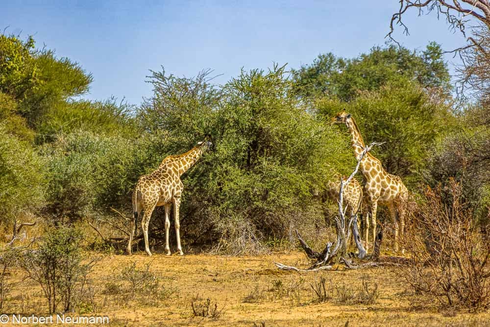 Die Pirschfahrt geht weiter. Wir verlassen das Ufer und scheuchen eine große Gruppe Perlhühner auf. Majestätisch schreiten ein paar Giraffen durch das Gestrüpp. Vorsichtig zupfen sie Blätter von den Zweigen.