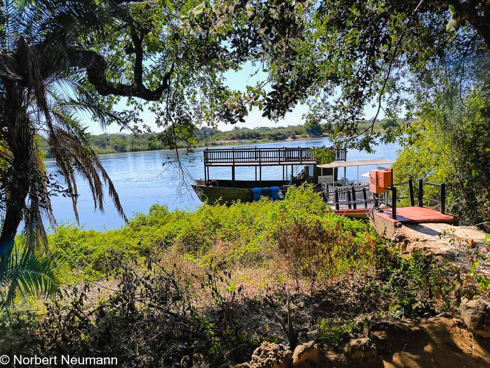 Schnell ziehen wir uns um und genießen anschließend ein üppiges Frühstück in der Chobe Safari Lodge. Wir machen einen kleinen Spaziergang zum Bootssteg. Am Ufer angekommen, lesen wir einige Warnhinweise. „Achtung: Flusspferde“ und „Achtung: Krokodile“ steht da. Es gibt auch einen Grillplatz und eine Strandbar. Von hier aus startet heute Nachmittag um 15:00 Uhr unsere Bootssafari. Bis dahin heißt es entspannen.