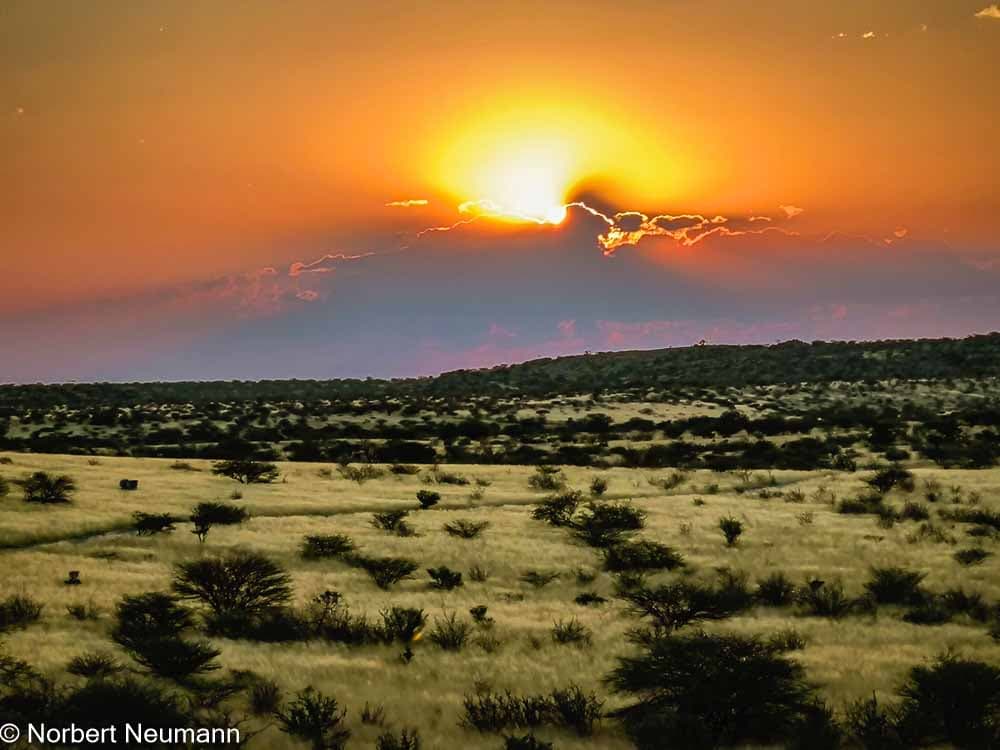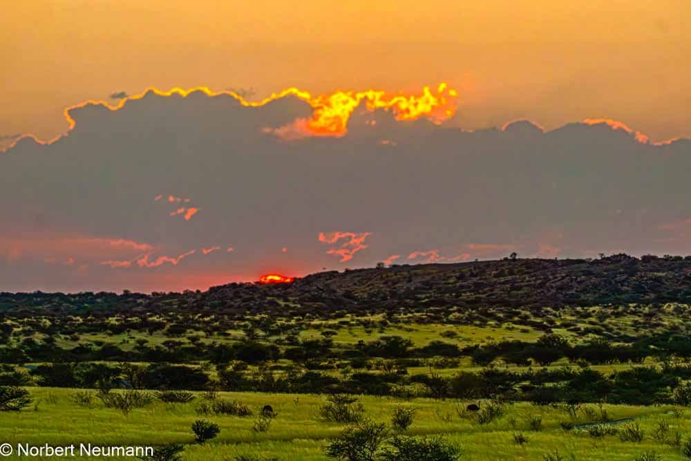 Der Tag startet mit einem fantastischen Sonnenaufgang. Die ersten Strahlen der Sonne strahlen über die Granitgipfel des Erongo-Gebirges und tauchen die Felsen in ein warmes Licht.