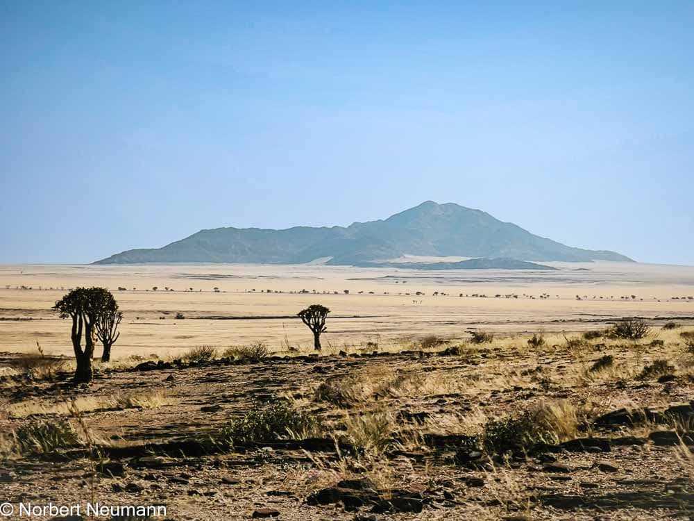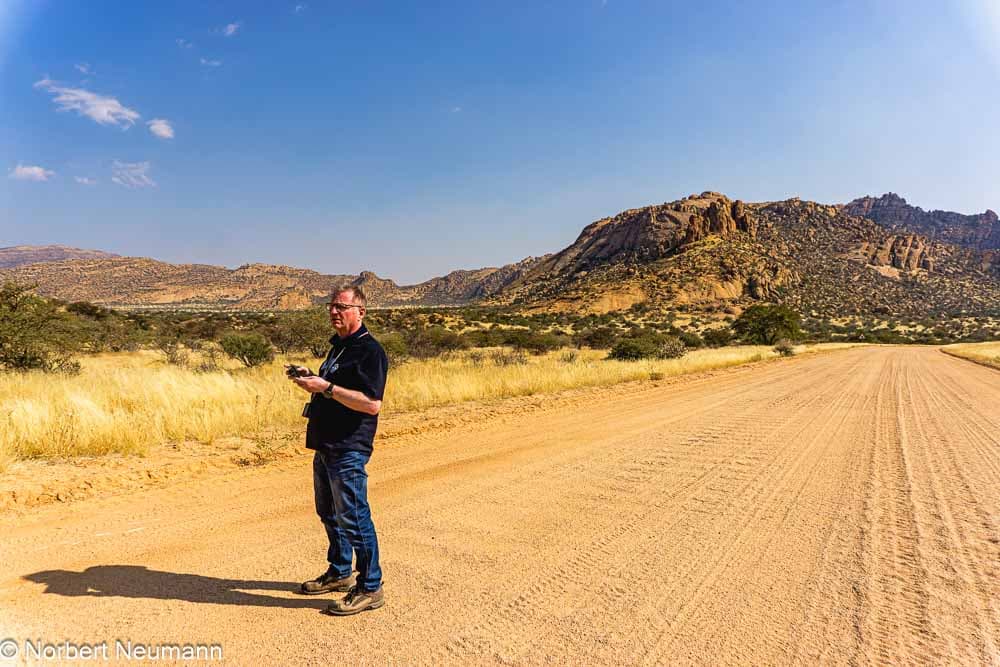Kurz nach unserer Abfahrt um 10:00 Uhr öffnet sich die Landschaft. Der Weg führt durch eine weite Savanne, die allmählich in eine Halbwüste übergeht. In der Ferne ist die bekannte Spitzkoppe, ein Inselberg, sichtbar.
