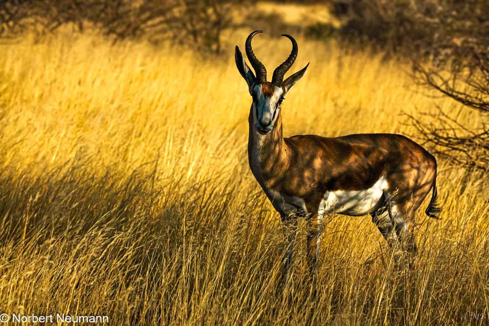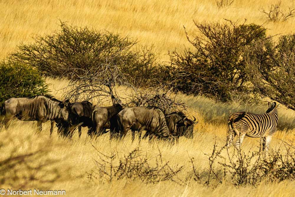 Das Terrain fällt nun leicht ab und wir kommen zu einem ausgetrockneten Fluss. Hier stehen auch einige Kameldornbäume. Etwas weiter sehen wir eine Herde Gnus, die im tiefen, goldenen Gras steht.