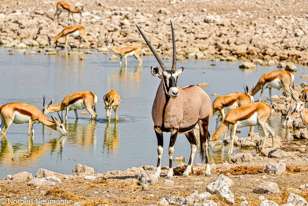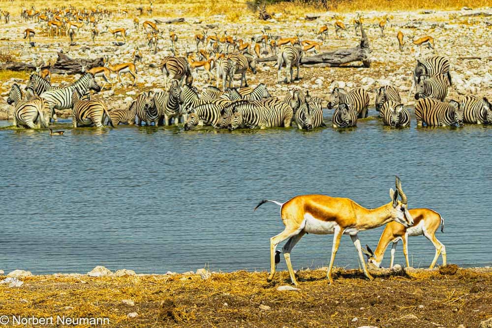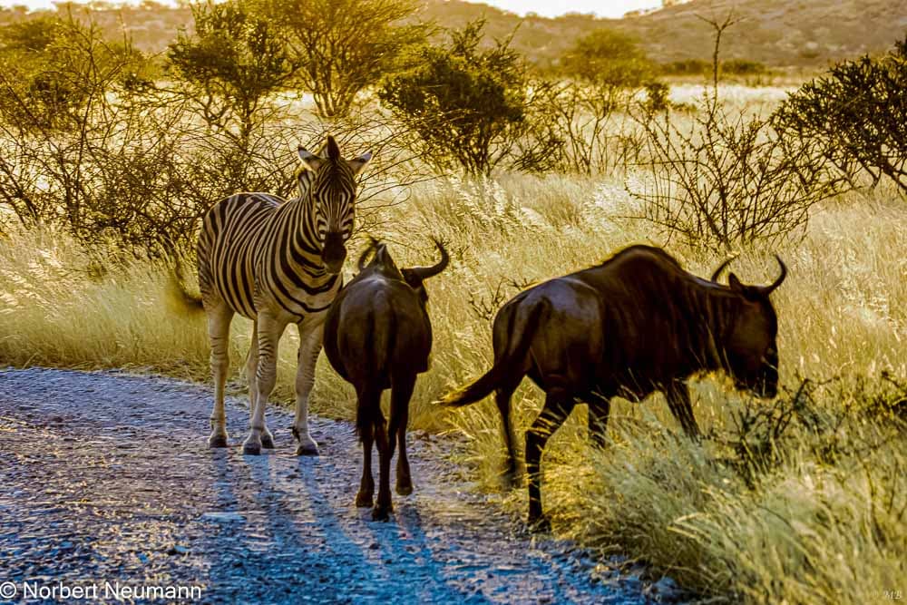 Die anschließende Safari findet im offenen Geländewagen statt. Während der Fahrt sehen wir viele Strauße, Springböcke, Gnus und Zebras.