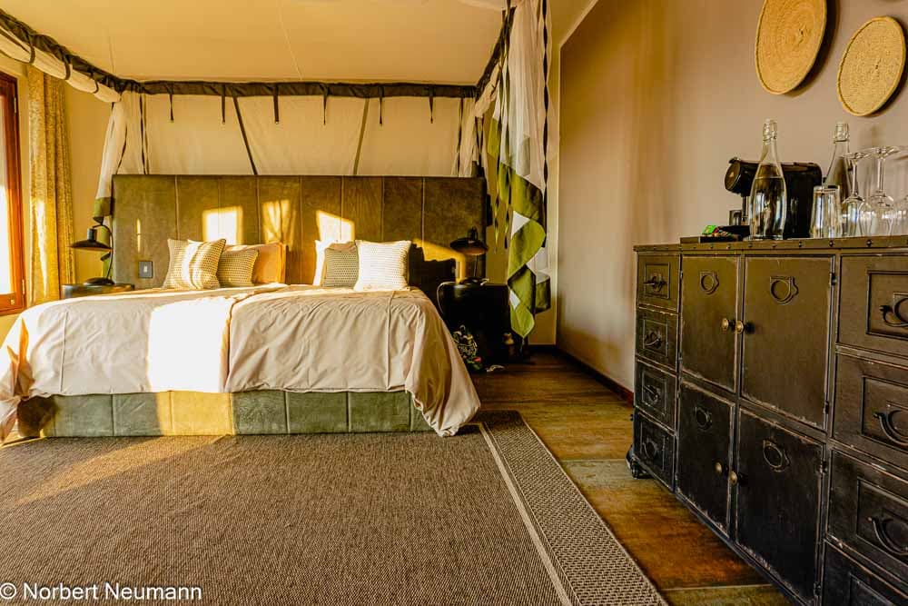Dafür ist das Badezimmer riesig. Eine freistehende Badewanne bietet einen Blick auf den Okavango. Es gibt sowohl eine Innen- als auch eine Außendusche. Die private Terrasse ist der perfekte Ort, um die Ruhe des Flusses zu genießen und ein Glas Wein zu trinken. Die gesamte Einrichtung ist stilvoll und vereint Komfort mit authentischem Safari-Charme.