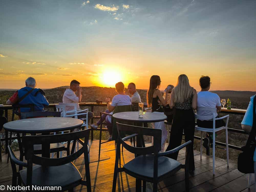 Wir kehren zum Geländewagen zurück und setzen unsere Safari fort. An einer speziell errichteten Plattform machen wir einen Halt, um den wunderschönen Sonnenuntergang zu genießen. Dazu gibt es kleine Snacks und Getränke. Wir sind wirklich im Paradies.