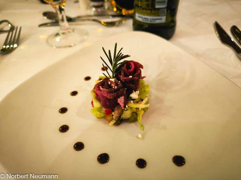 Zurück im Hotel erwartet uns um 18:30 Uhr das Abendessen. Ich habe mich für den atlantischen Seeteufel entschieden und bin begeistert.