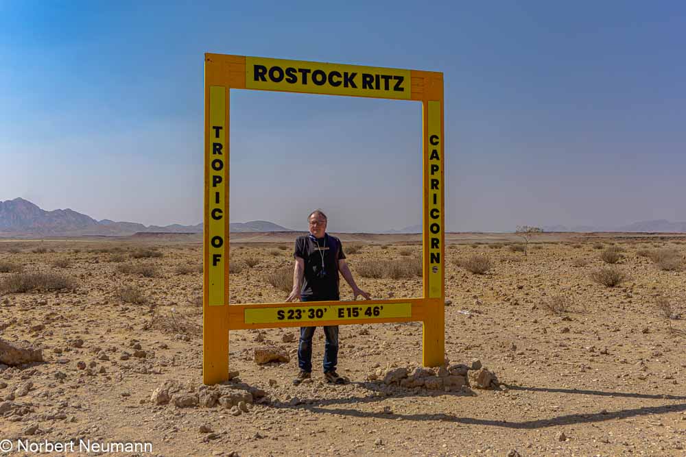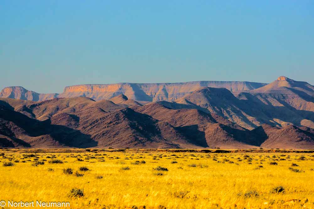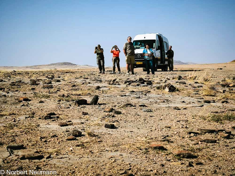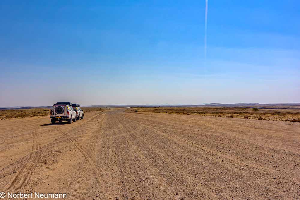Hinter Walvis Bay zieht der Nebel wie ein Vorhang weg, und plötzlich sehen wir die Wüste vor uns. Die Straße B2 wird zur C14, und links und rechts erstreckt sich eine endlose Ebene. Die Fahrt wird zu einem monotonen Kieselgeräusch durch die Steppenlandschaft.