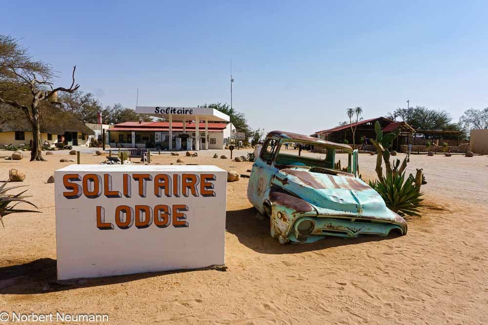Solitaire ist ein sehr kleiner, aber feiner Wüstenort. Viele Reisende nutzen ihn als Zwischenstopp und Tankstelle für Auto und Mensch. Solitaire selbst besteht nur aus einer Tankstelle, einem Laden, einer Kapelle und einer Bäckerei mit angeschlossenem Café. Eine Lodge und ein Zeltplatz runden den Ort ab.