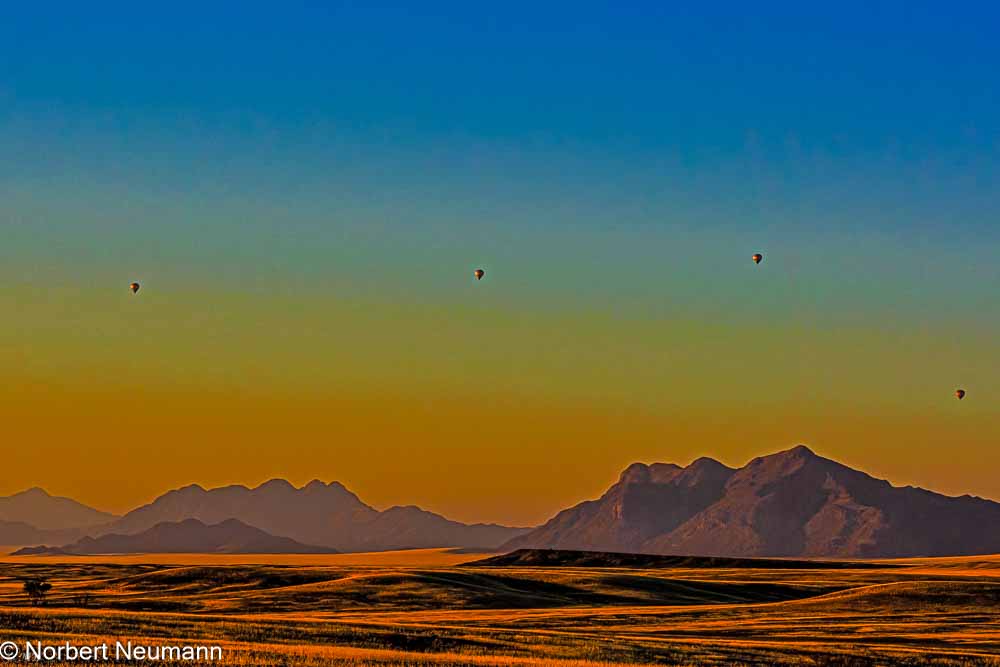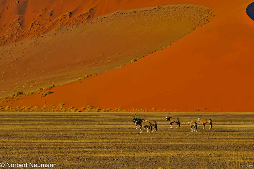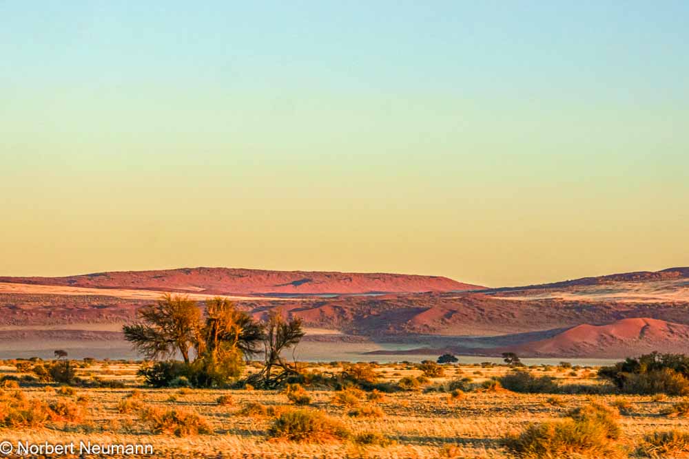Unser Ziel sind die Dünen am Sossusvlei. Vom Tor in Sesriem führt eine Straße in die Namib. Links und rechts erheben sich die ersten Dünen, die im Zwielicht noch grau erscheinen. Doch dann, ganz allmählich, beginnt das Schauspiel: Die Sonne geht auf, und die Dünen erwachen zum Leben. Zuerst ein Hauch von Rosa, dann ein kräftiges Orange, schließlich ein tiefes Rot. Einfach atemberaubend!