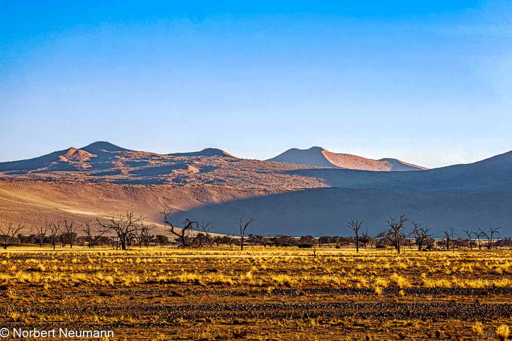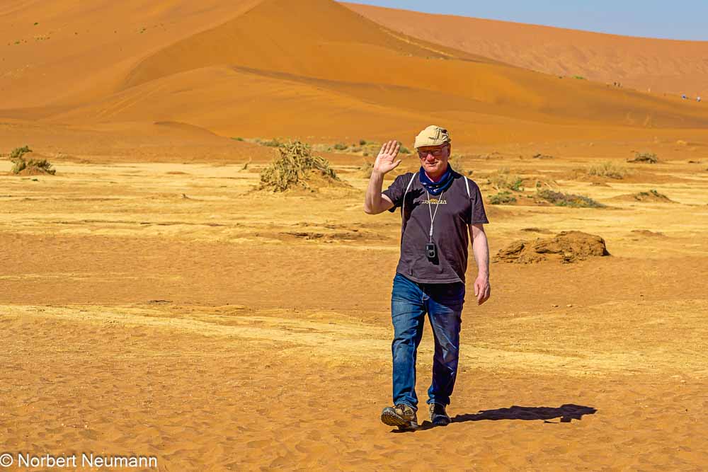 Endlich sind wir angekommen. Geradeaus gelangt man zum Dead Vlei, und links davon beginnt der Aufstieg zur Düne. Christopher zeigt uns den Weg und erklärt, welchen Punkt auf der Düne wir unbedingt erreichen müssen, um sicher wieder ins Dead Vlei absteigen zu können.