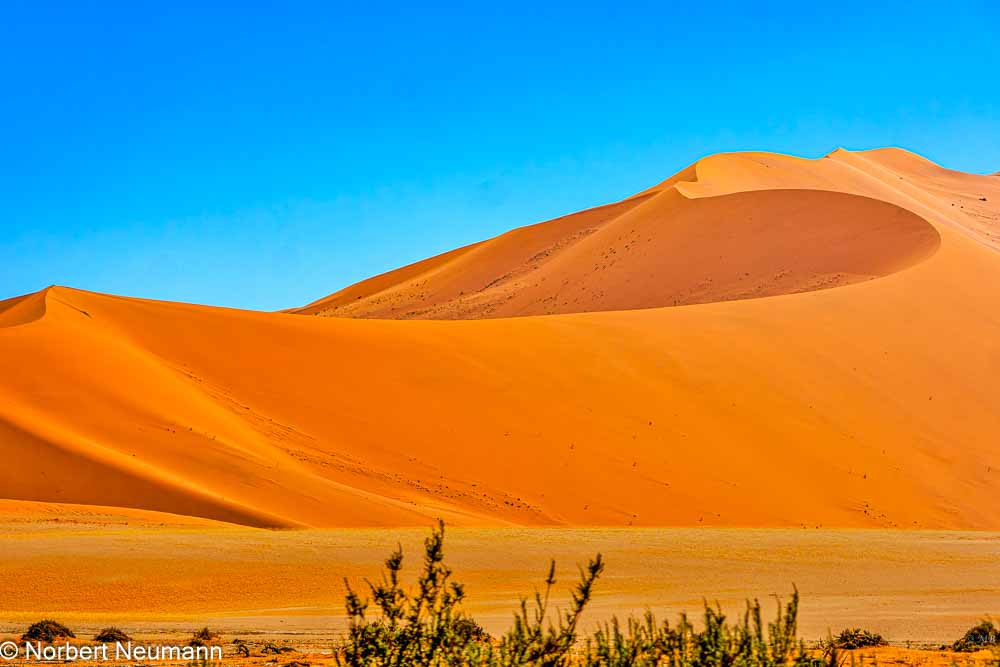 Die Düne 45 steht wie ein Monument am Straßenrand. Ihr Grat ist scharf wie ein Messer. Diese Düne liegt bei Kilometer 45 zwischen Sesriem und Sossusvlei, was ihren Namen erklärt. Wir lassen die Düne hinter uns und fahren weiter.
