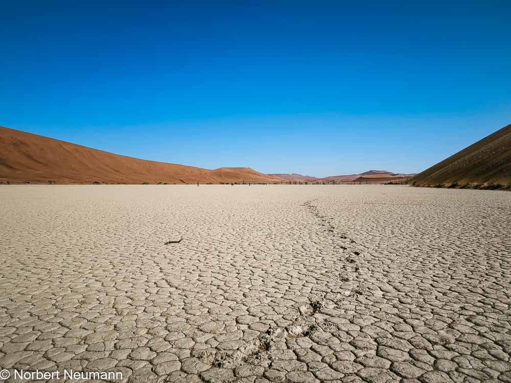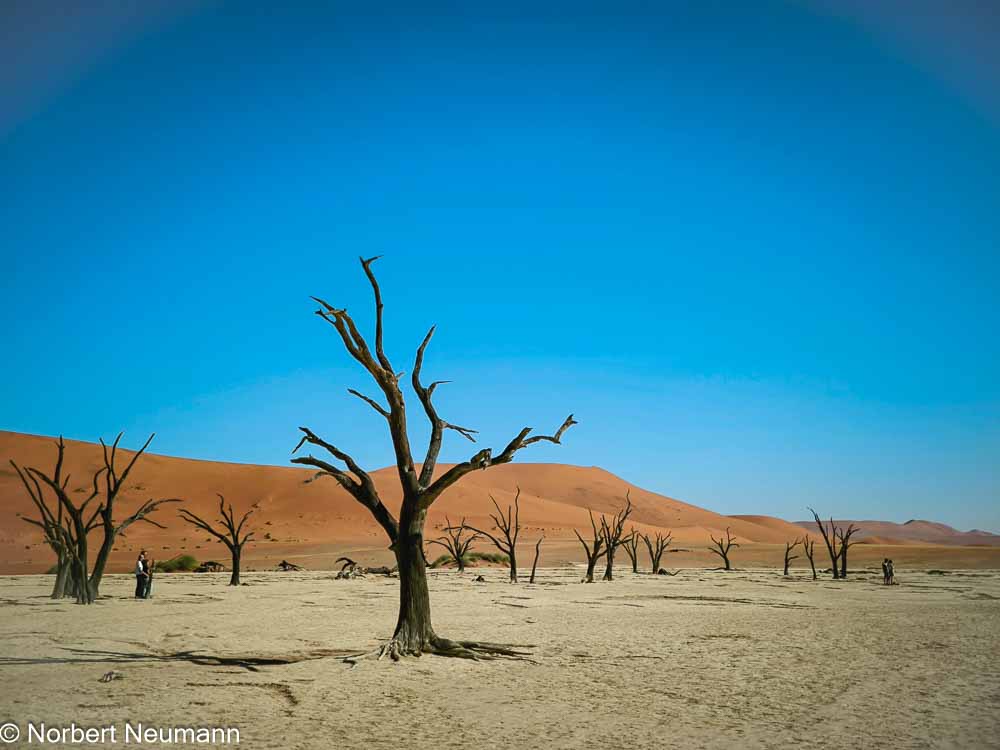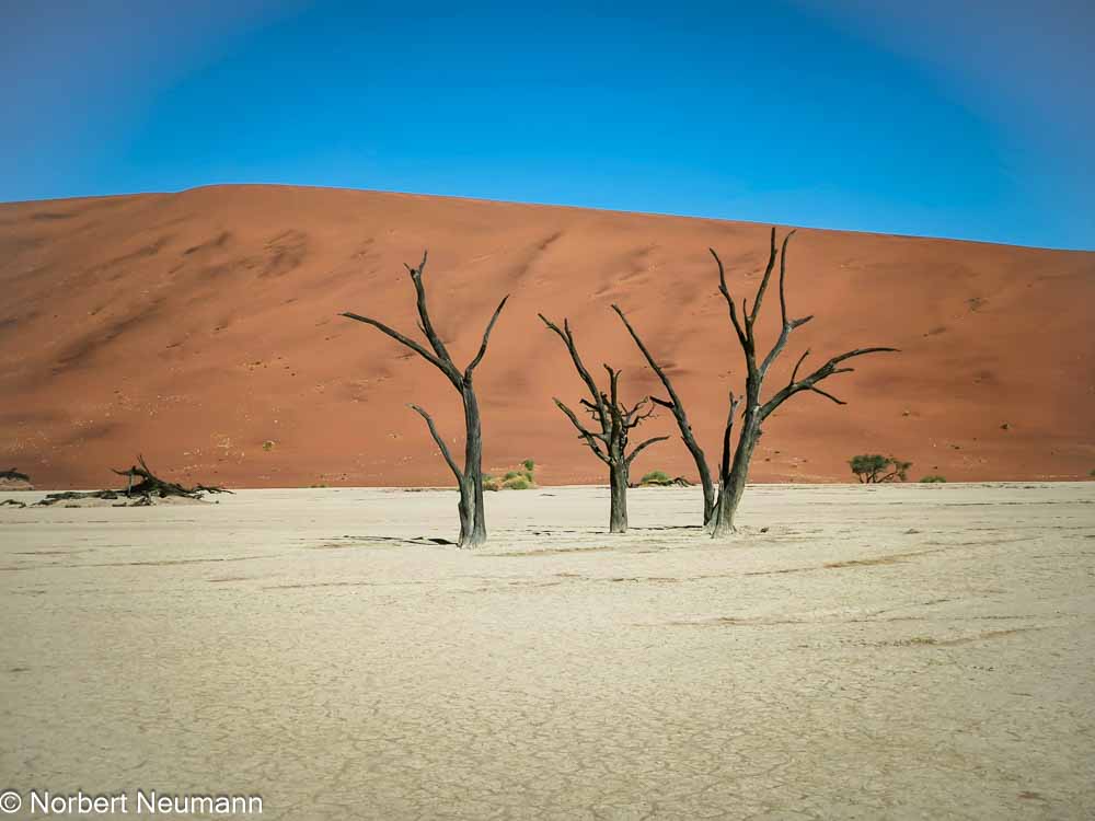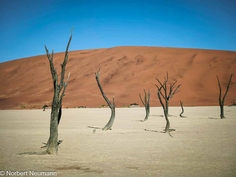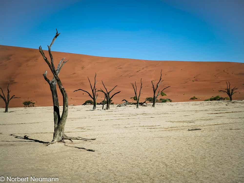 Hier im Dead Vlei herrscht eine seltsame, friedliche Stille. Es weht kein Lüftchen, und die abgestorbenen Bäume stehen seit Jahrhunderten hier und sehen aus wie groteske Skulpturen. Der Boden ist hart und hell, fast weiß.