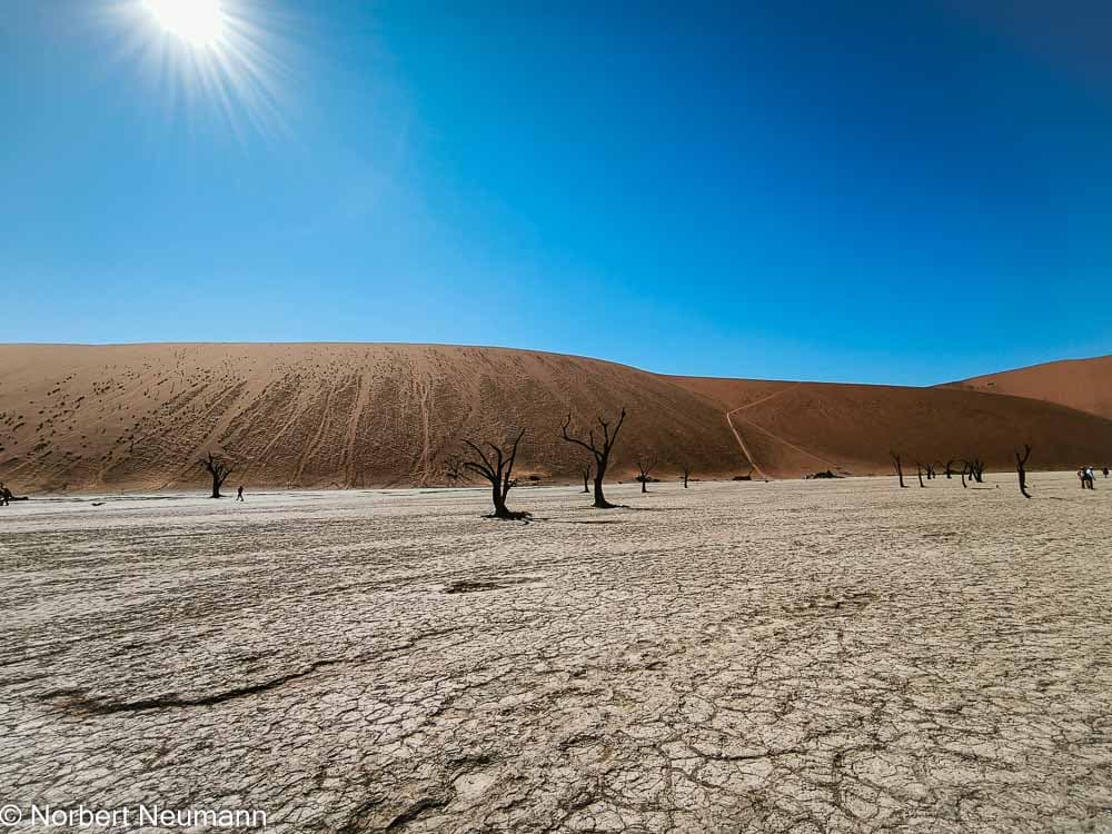 Das Dead Vlei liegt unter uns wie ein trockener, weißer See, in dem die dunklen, verkohlten Silhouetten der jahrhundertealten Kameldornbäume wie Treibholz erscheinen. Zwischen diesem Treibholz sind winzige Menschen auszumachen. Sie sehen aus wie Ameisen.