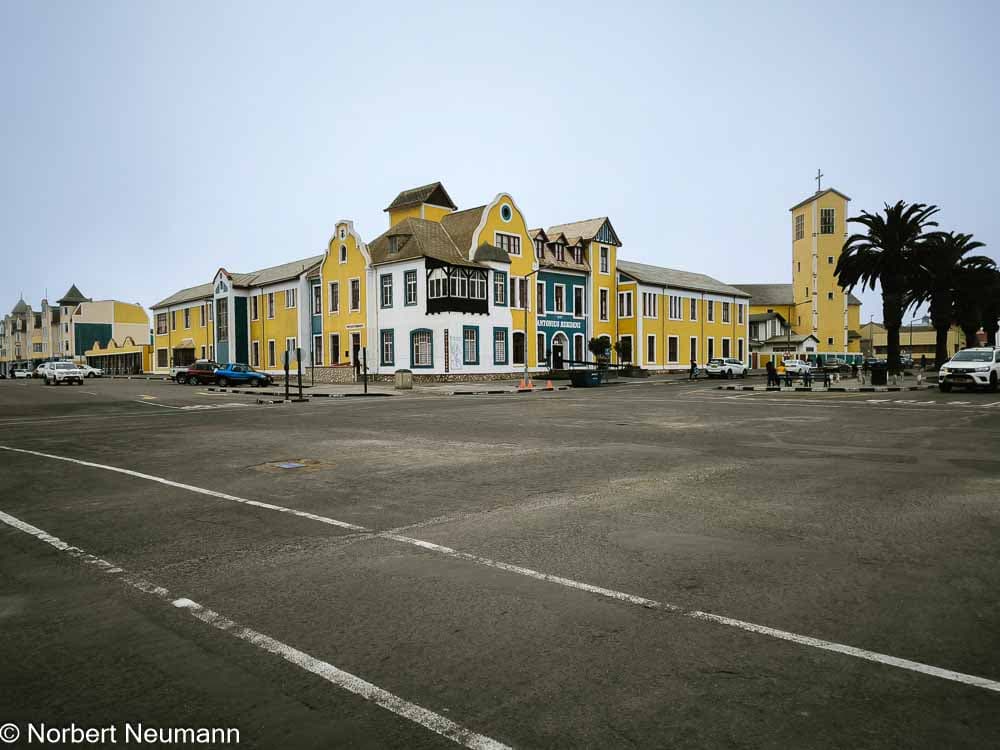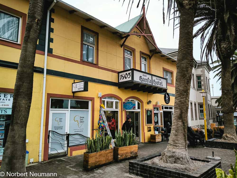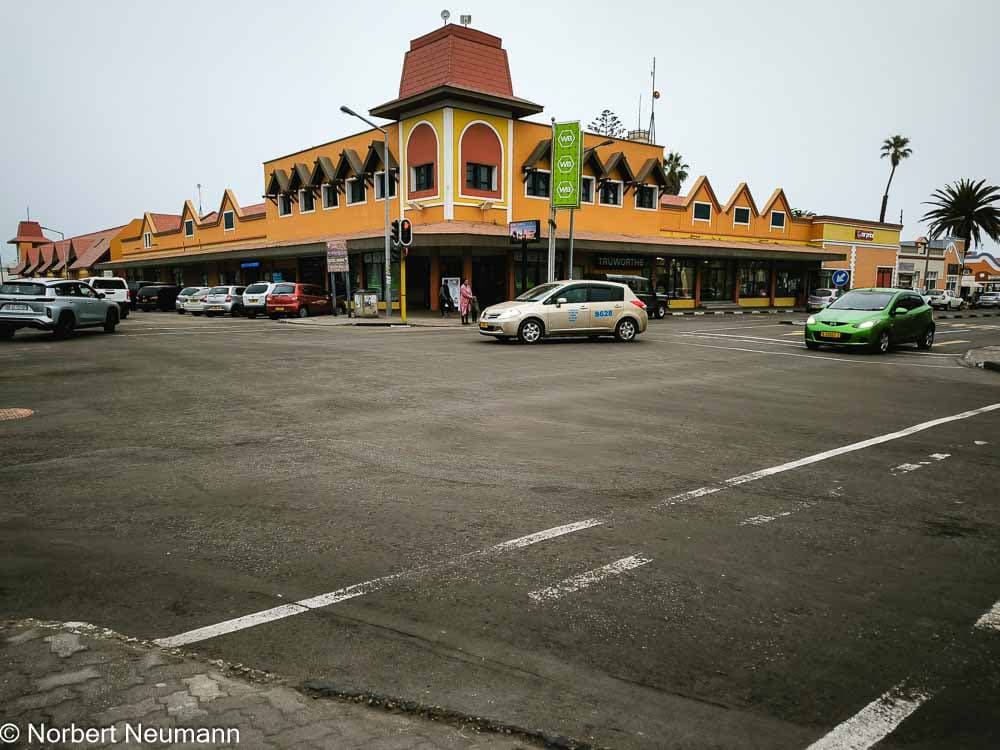 Vorbei an der Mole und dem Leuchtturm am Atlantikufer werfen wir einen Blick auf das Woermannhaus mit seinem markanten Turm und das Alte Amtsgericht. Die Straßen in Swakopmund sind für diese kleine Stadt extrem breit und großflächig angelegt. Der alte Bahnhof wurde mittlerweile zu einem Hotel umgebaut. Auch das Hohenzollernhaus ist ein wichtiges Baudenkmal.