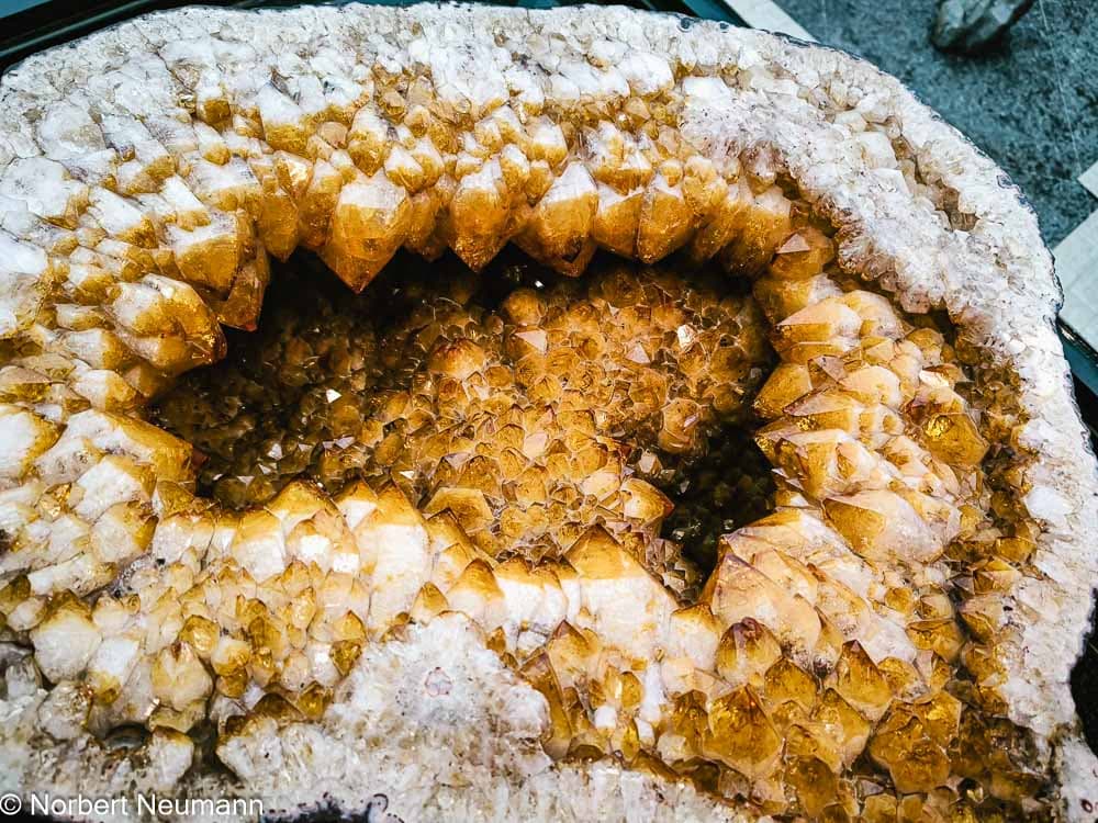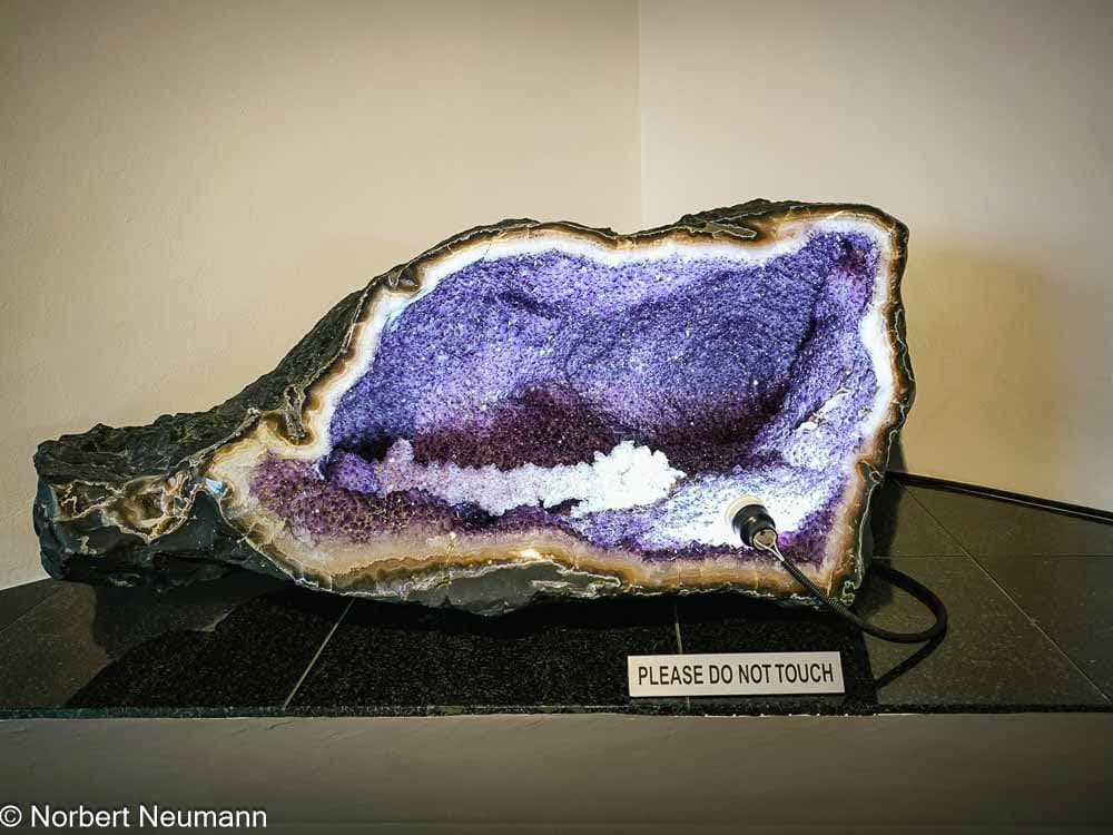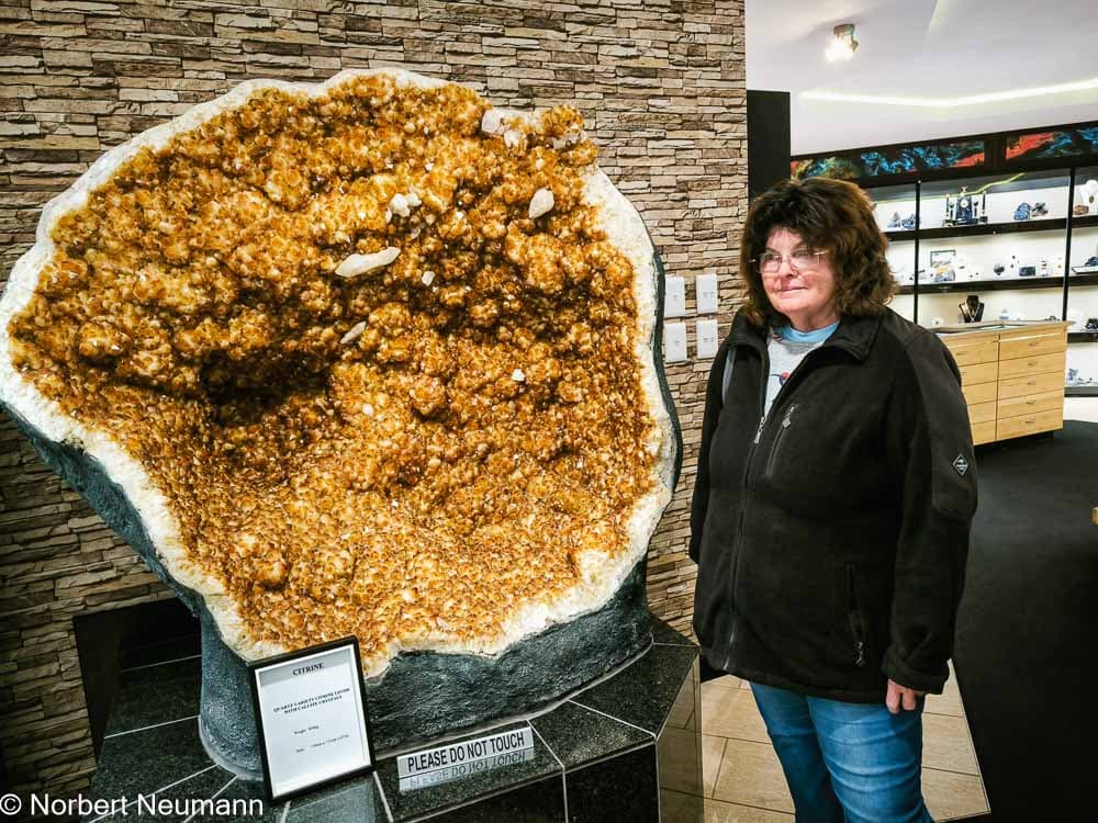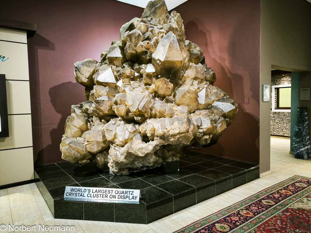Es bleibt noch etwas Zeit bis zum Abendessen, also beschließen wir, gegen 15:00 Uhr zur Kristall Galerie in Swakopmund zu gehen. Die Kristall Galerie ist ein modernes Mineralienmuseum. Teil der Ausstellung ist der größte Kristall der Welt. Hier werden zahlreiche Edel- und Halbedelsteine aus ganz Namibia gezeigt, jeder schöner als der andere. Natürlich gibt es nach der Ausstellung die üblichen Verkaufsräume, aber wir werden nicht zum Kauf gedrängt.