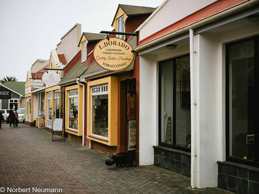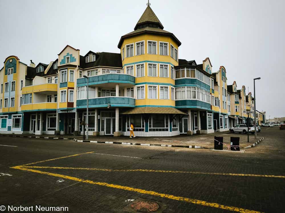 Um 14:00 Uhr können wir dann endlich unser Zimmer beziehen. Danach bummeln wir durch den „Swakopmund-Central“, den historischen Stadtkern von Swakopmund. Viele Gebäude stammen aus der Zeit der deutschen Kolonialherrschaft (ca. 1900–1915) und zeigen typische Merkmale wie Erker, Türmchen und Giebel. Die Fassaden sind in sanften Pastelltönen gehalten. Die Bauwerke bestehen aus massiven Steinstrukturen und sind mit Holzverzierungen im Jugendstil kombiniert.