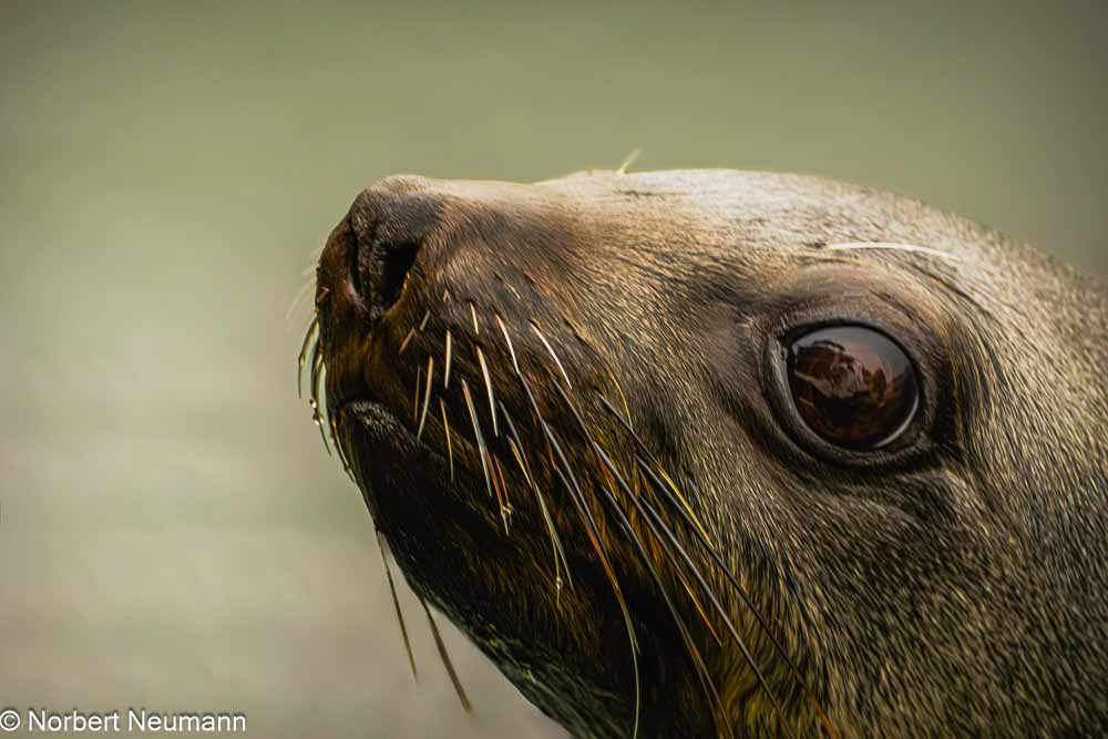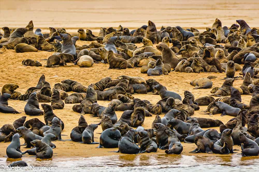 Wir fahren an vielen Austernfischern vorbei. Nach etwa einer dreiviertel Stunde sehen wir den langen, schmalen Sandstreifen von Pelican Point mit dem Leuchtturm. Und bevor wir näher kommen, hören wir sie schon — ein tiefes, kehliges Konzert aus Grunzen, Bellen und Fauchen.