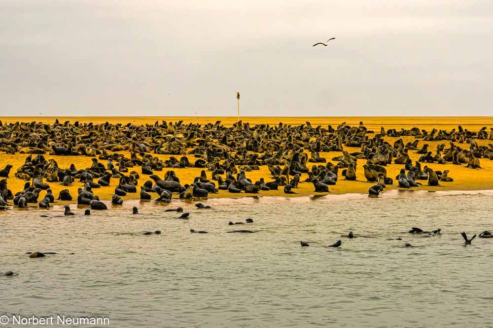Für morgen gibt es verschiedene Möglichkeiten. Wir können uns zwischen einer Katamaranfahrt, einer Living Desert Tour, einem Rundflug über die Wüste, einer Radtour oder… entscheiden. Alles ist optional und muss vor Ort zusätzlich bezahlt werden. Wir wählen die Katamaranfahrt in der Bucht von Walvis Bay zu einer großen Robbenkolonie am Pelican Point.