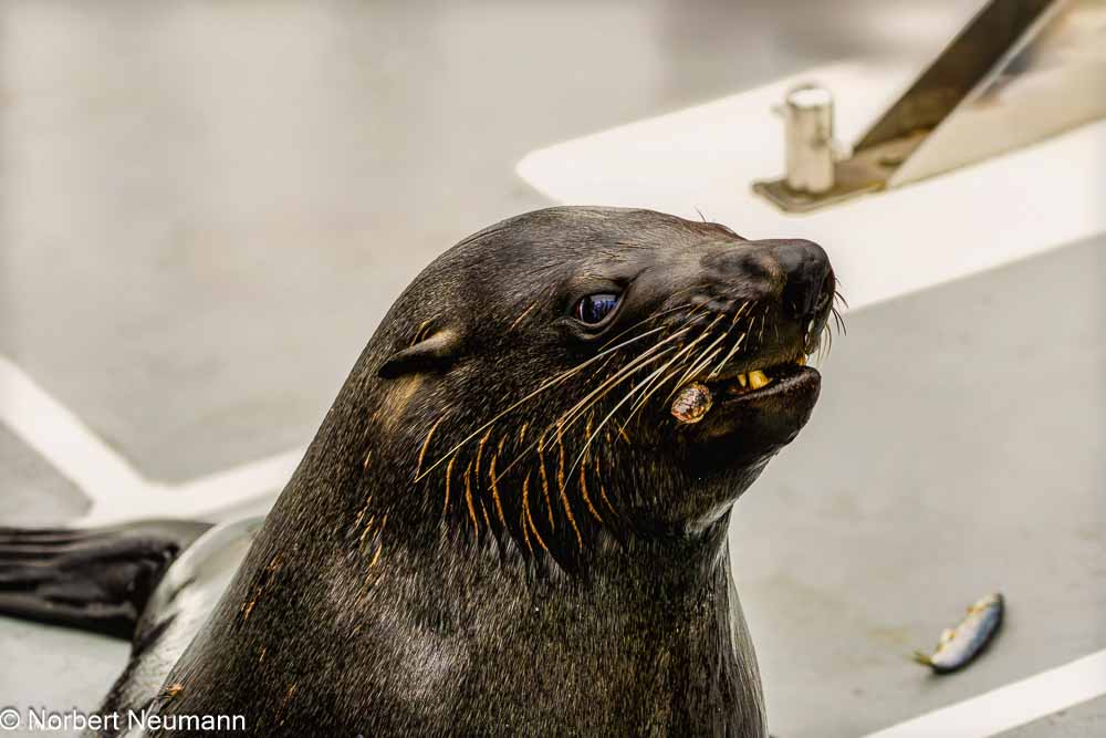 Kaum haben wir die geschützte Bucht verlassen, weht ein frischer Wind über das Deck. Zum Glück sind genug warme Decken vorhanden. Bevor der Katamaran richtig Fahrt aufnimmt, springt noch ein blinder Passagier an Bord. Zu unserer Freude ist es eine Seerobbe.Der Kapitän und die Robbe scheinen beste Freunde zu sein, denn sie bekommt zur Begrüßung ein paar Snacks.
